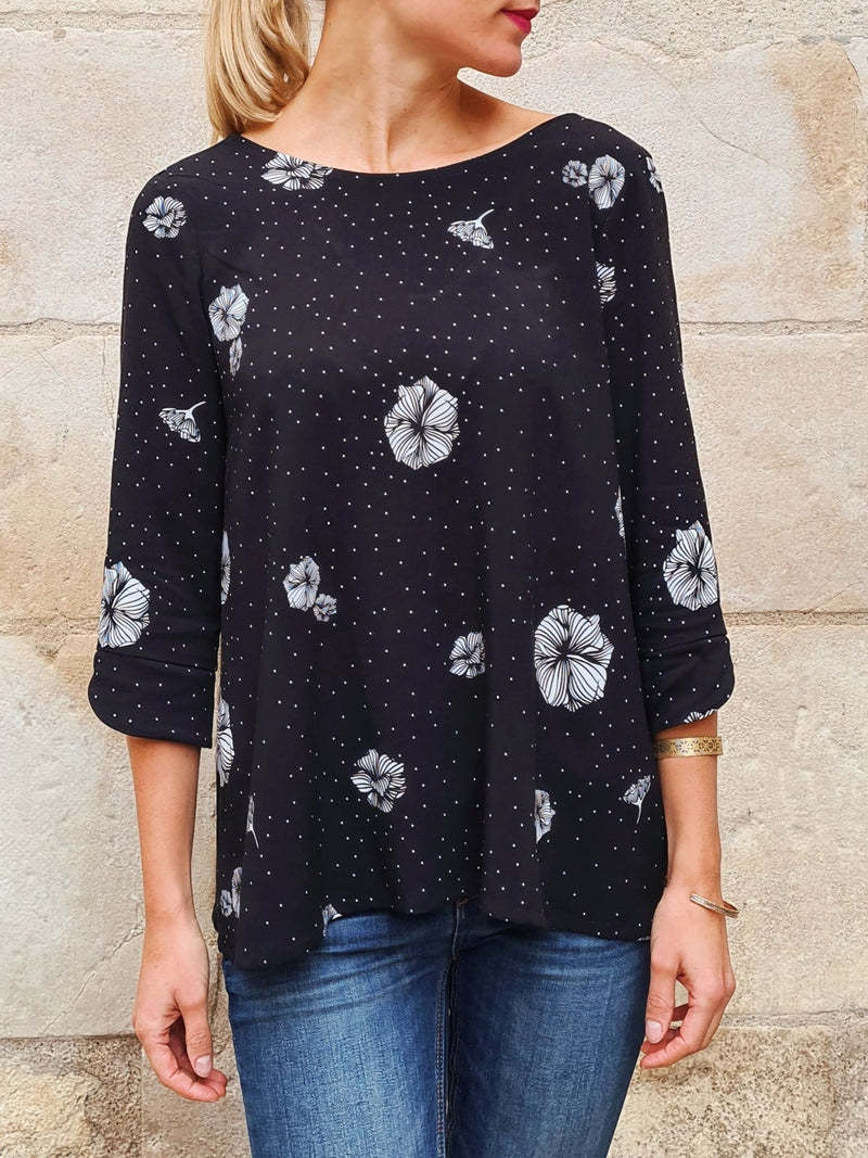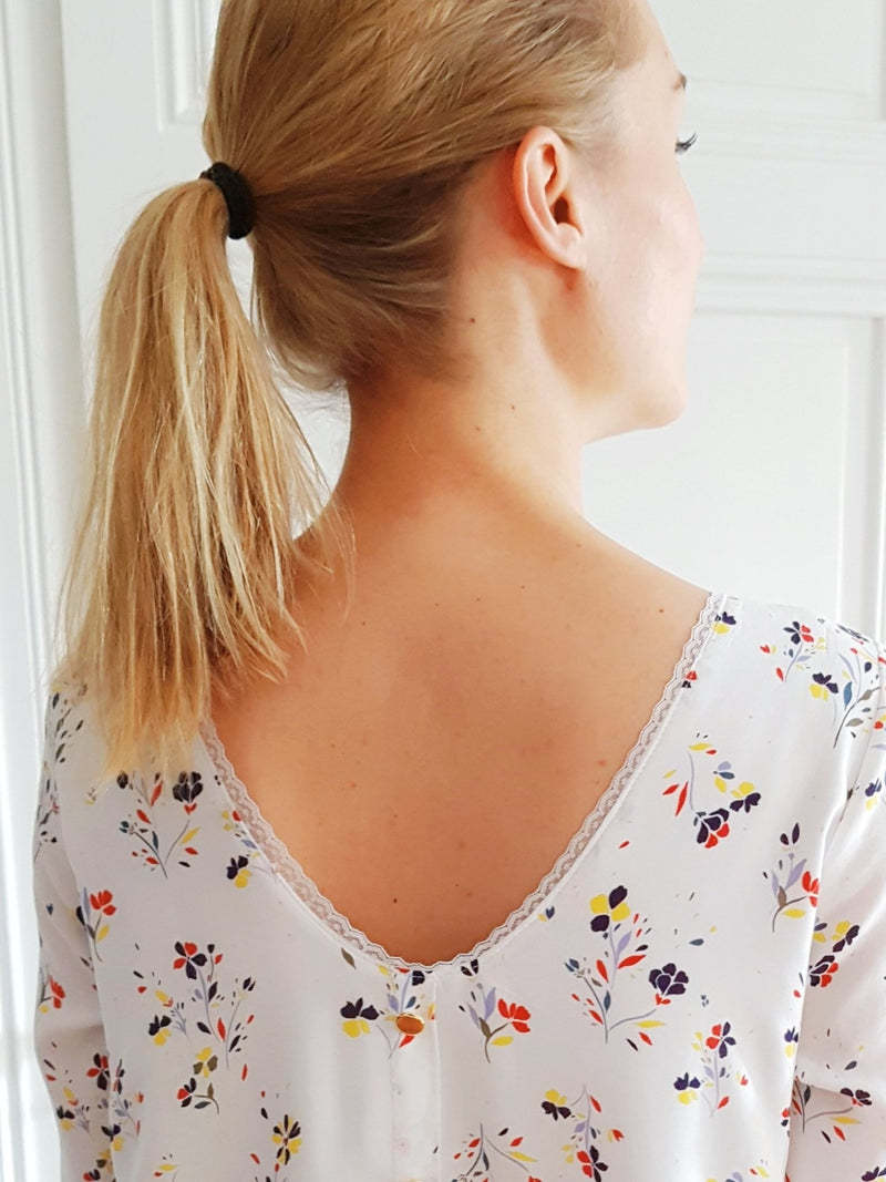Avec sa forme évasée et son dos boutonné élégant et astucieux, Poppy est chic et sobre à la fois. Ajoutez des bas de manches délicatement travaillés et vous obtenez une blouse ou une robe légère et vaporeuse, aussi facile à coudre qu’à porter (niveau 1/5).
