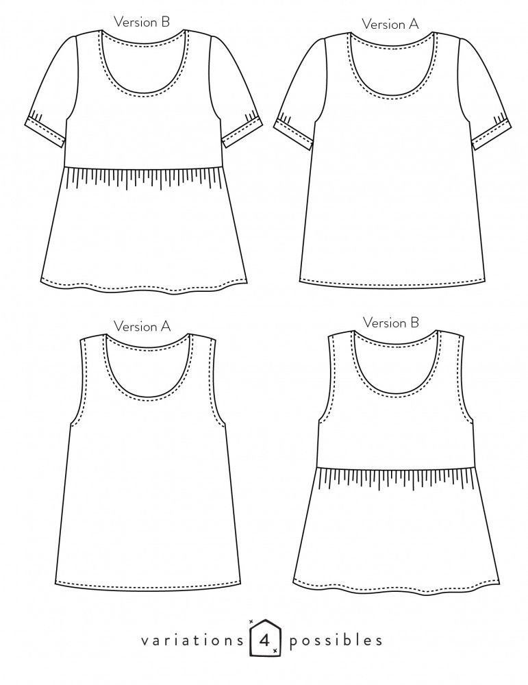 Blouse épurée à l’encolure ronde finie par un biais plaqué. Manche courte légèrement arrondie et froncée au-dessus du bracelet de manche qui la termine. A décliner en blouse à basque froncée, le tout avec ou sans manche.