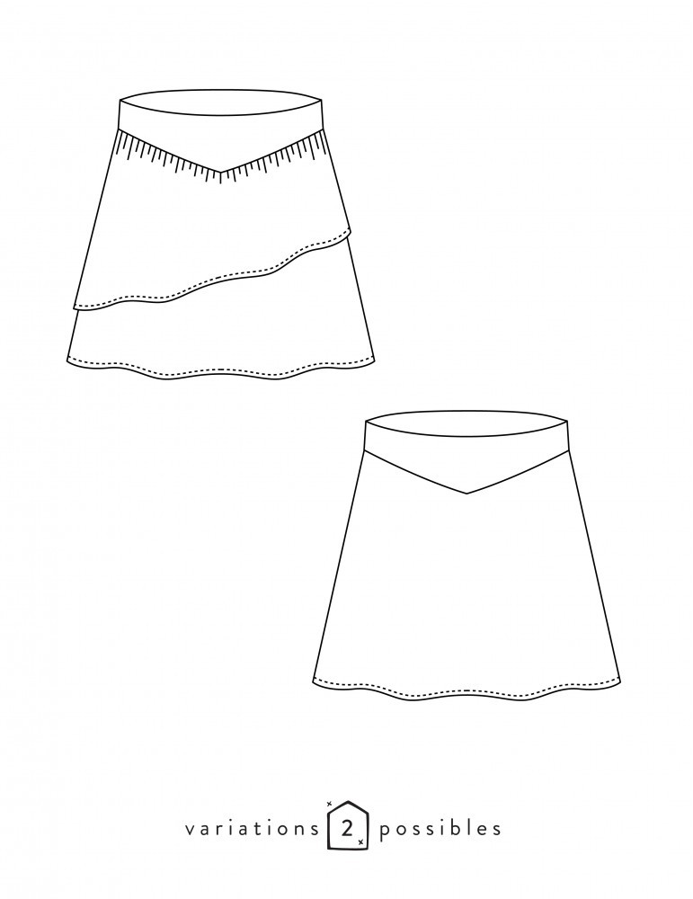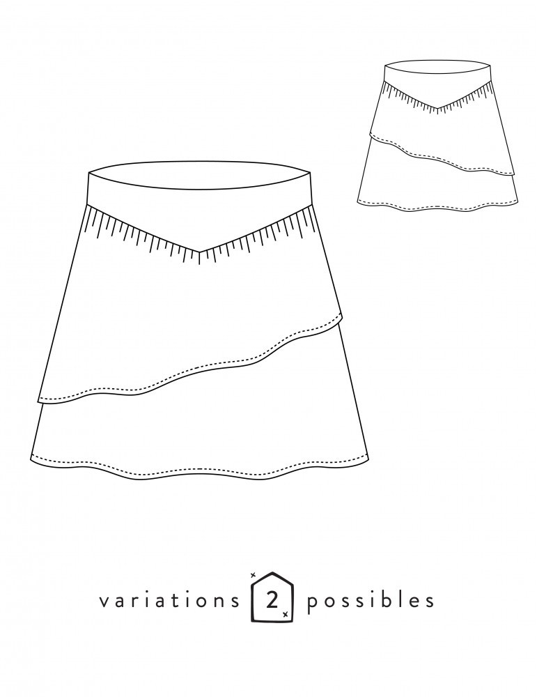 Cette jupe plutôt courte est composée de 2 éléments superposés, assemblés sur une ceinture large en forme de V sur le dos et le devant. Pour une version très sobre, vous utiliserez la jupe du dessous: évasée, simple et symétrique. Pour un vêtement plus romantique, ajoutez la jupe de dessus: froncée et asymétrique. La fermeture se fait sur le côté gauche au moyen d’un zip invisible et d’une agrafe.