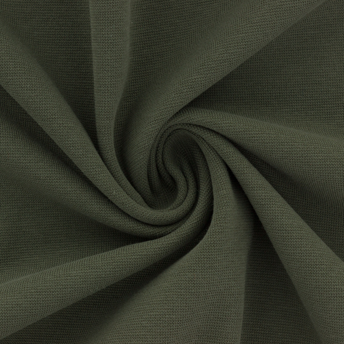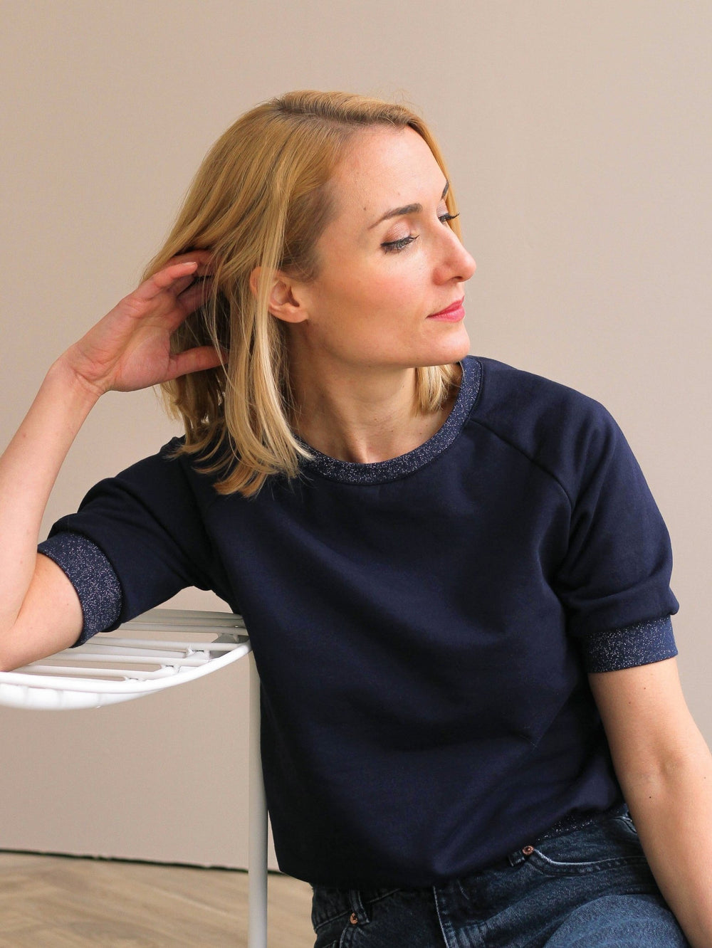 Pour le tissu principal, nous vous recommandons de choisir une maille sweat de poids moyen à lourd. Pour les bandes des poignets, du bas et de l’encolure, l’idéal est de trouver un bord côte coordonné. Si vous n’en avez pas vous pouvez aussi utiliser une maille jersey présentant un taux d’élasticité important (minimum 40%).
