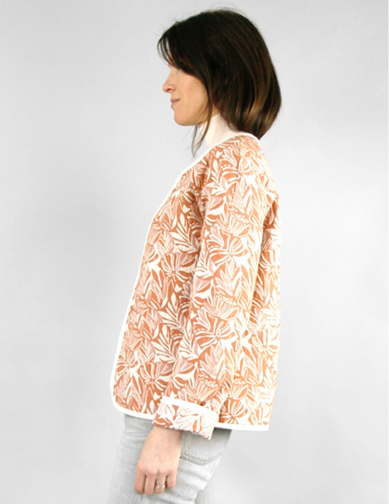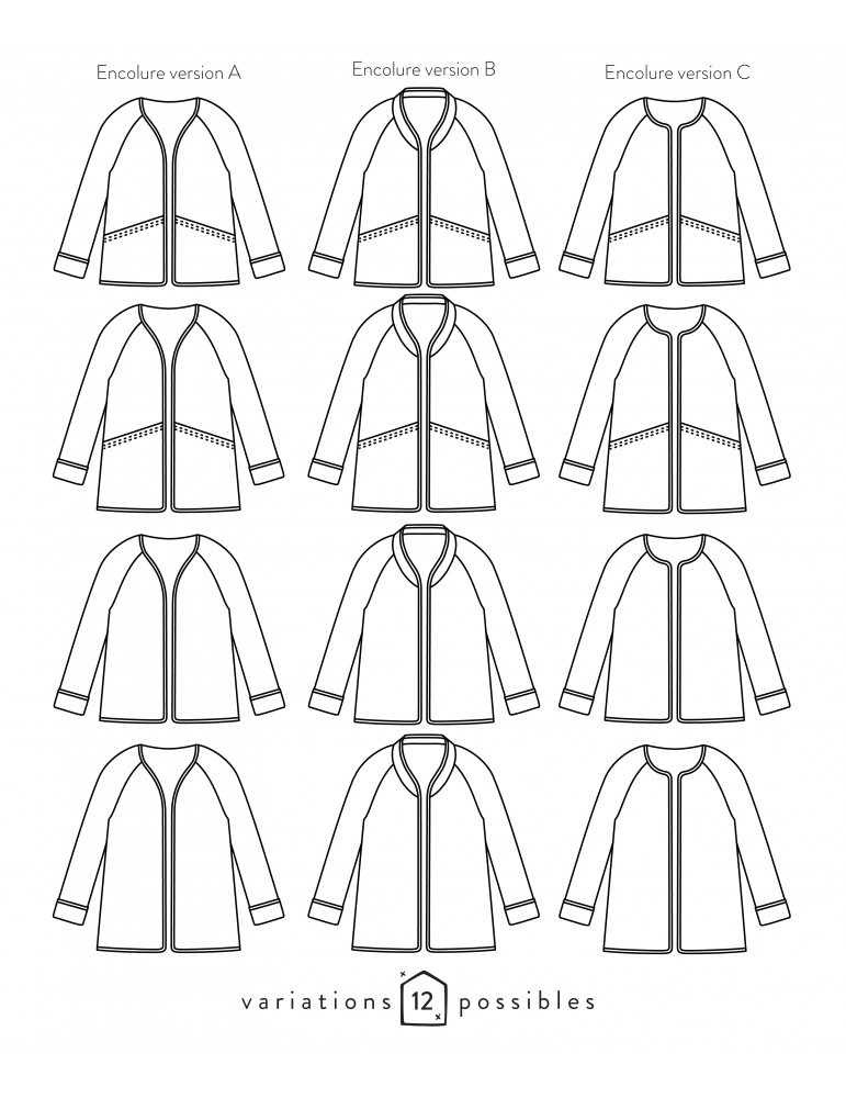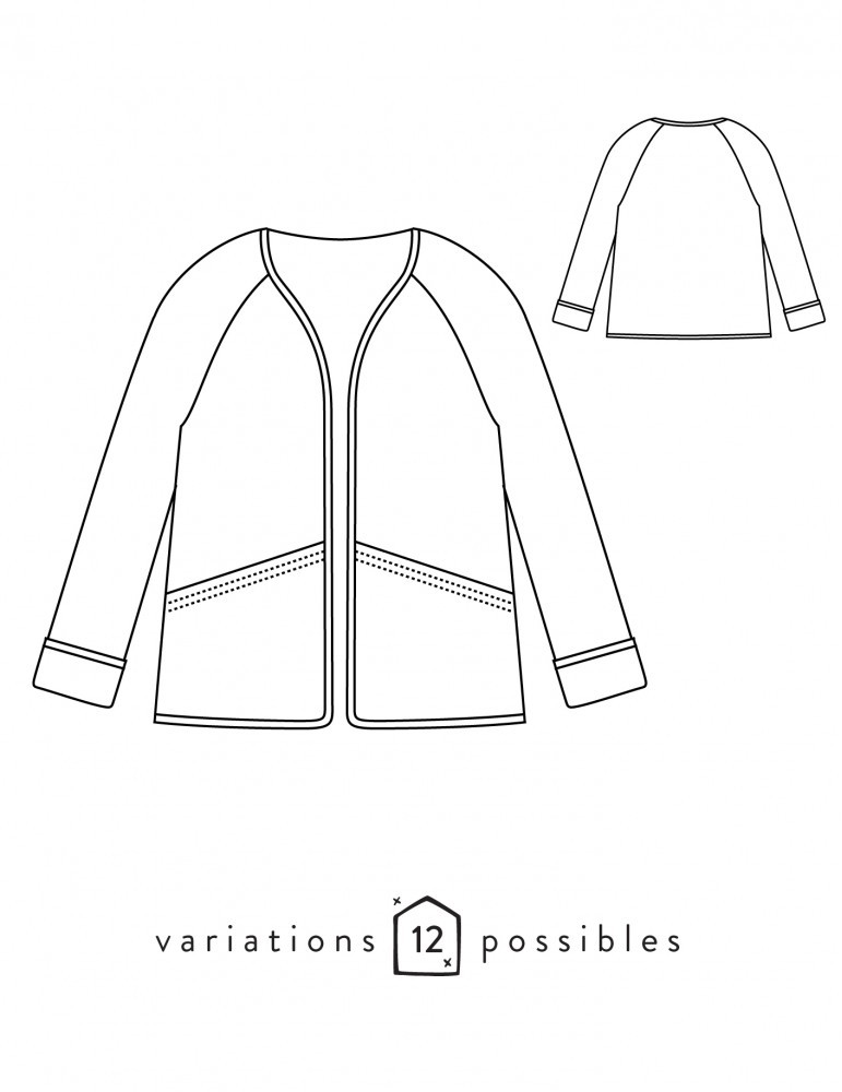 Non doublé, ce modèle adopte une finition bordée sur son pourtour. Il propose deux longueurs, une grande poche plaquée, deux formes d’encolure et un col semi-plat en option. Composé de peu de pièces, c’est un modèle rapide et facile à coudre.